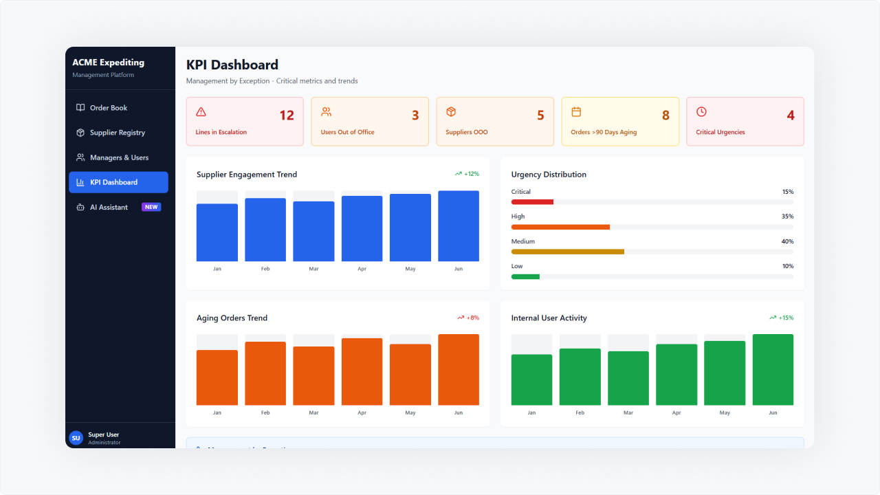 Designed for expeditors, operational procurement teams, and project managers managing critical supplies with frequent follow-ups and risk of delays.