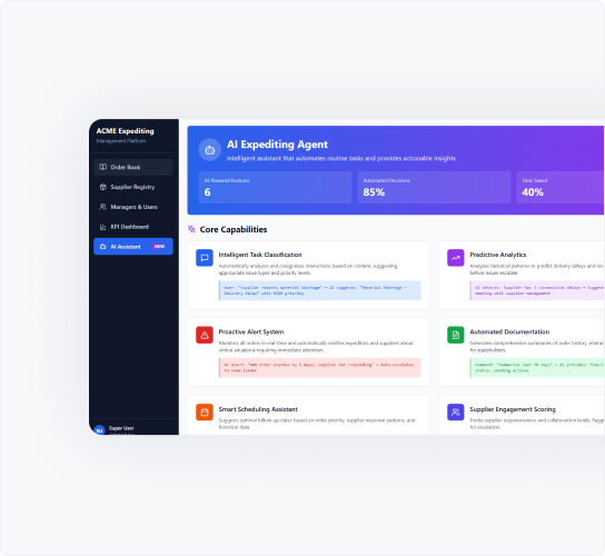 Expediting AI guides suppliers and internal users on their relevant tasks, analyzes the critical path through targeted questions, requests supporting evidence based on defined procedures, and retrieves existing information from connected systems.